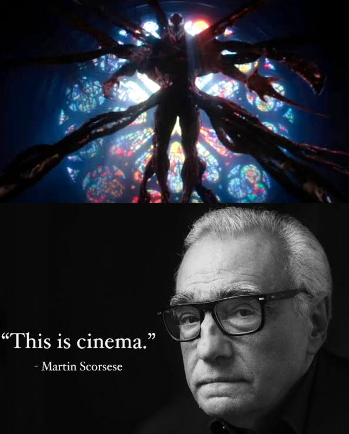 As a satirical jab at Martin Scorsese, the veteran director's face is placed below the scene. It not only conveys the cinematic nature of the aforementioned scene but also mocks the director's infamous disdain towards comic-book films in general. Interestingly, Richardson has also collaborated with Scorsese for films like Hugo and The Aviator.