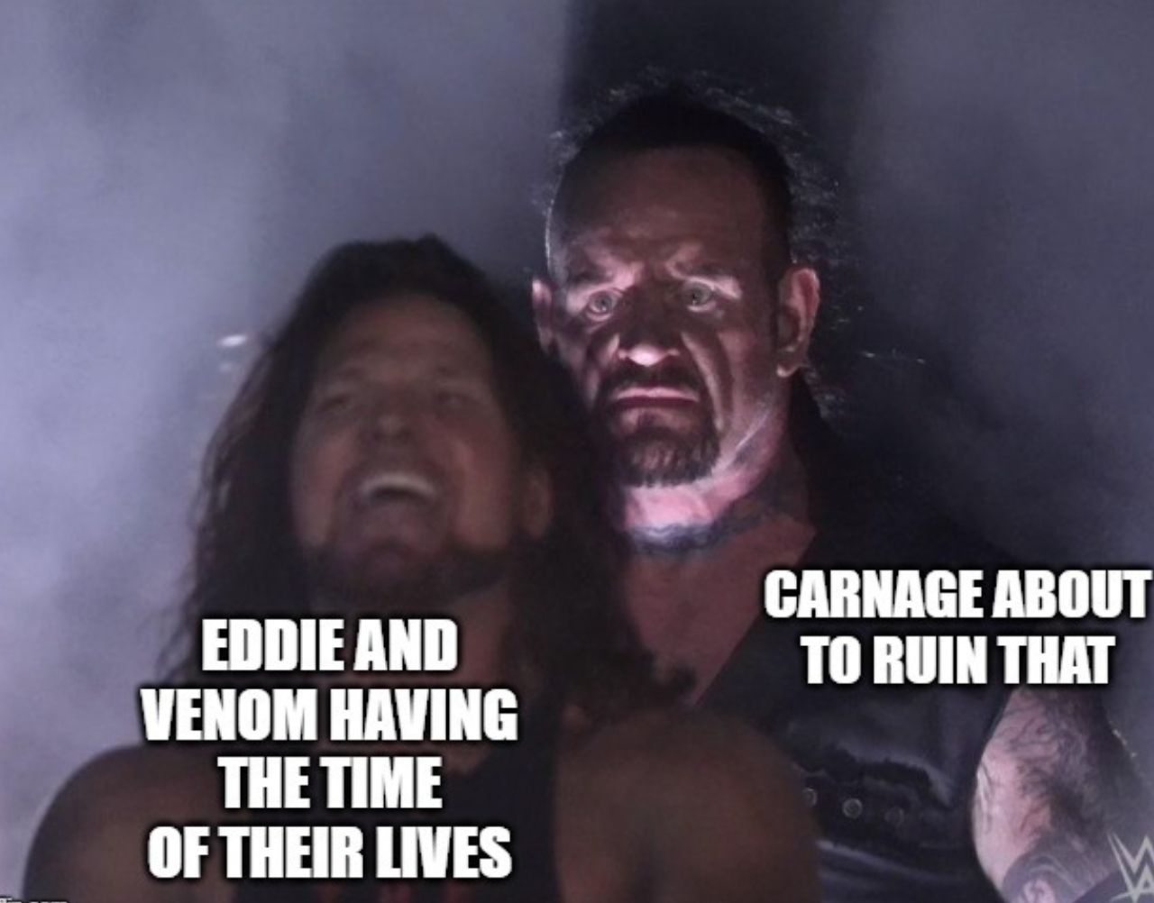 But of course, when Carnage gets unleashed later, Eddie and Venom's peaceful life is bound to be disturbed. In the context of this meme, the protagonist is equated to the WWE wrestler AJ Styles who is walking without a worry, while an intimidating Undertaker stares at him from behind.