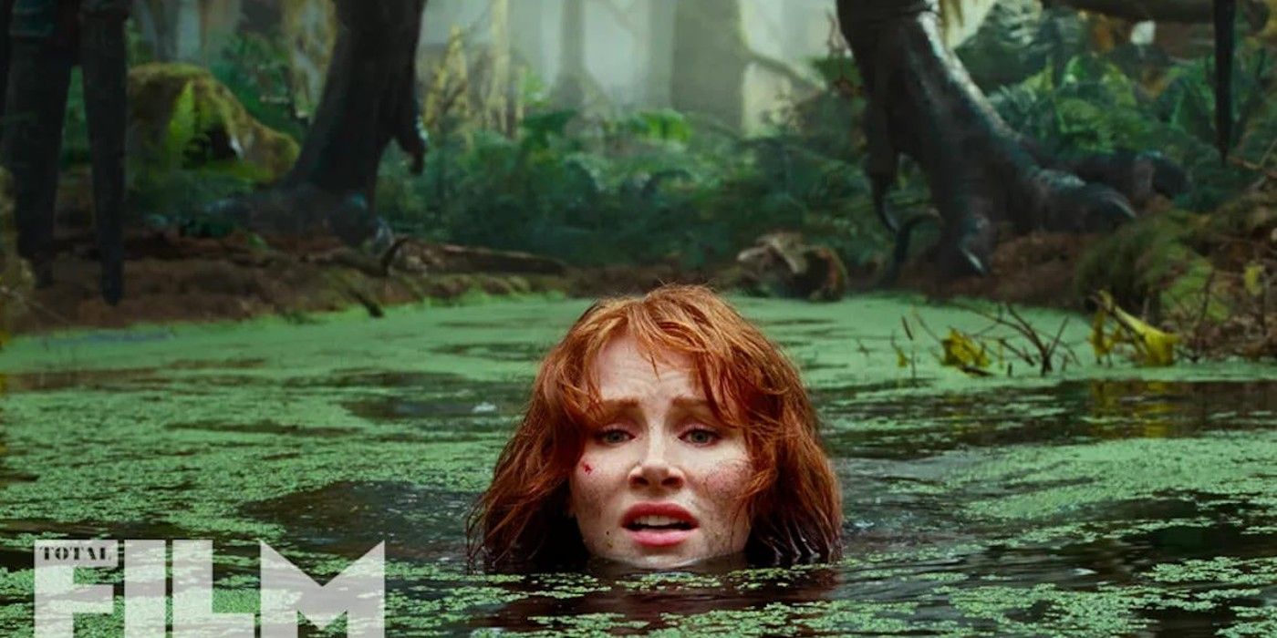Now, Universal has released the first official image from the movie, to be published in Total Film's 2022 Preview issue, which teases what Howard's character has in store during the new era. In the picture, Howard is frantically swimming through the algae of a tropical river, surrounded by what appears to be a thick rainforest. Upon closer inspection, the stalks behind her are not trees, but rather the legs and arms of a pursuing dino. From the looks of it, the dinosaurs' transition into the civilized world isn't going to be a peaceful one. Here's a first look at Jurassic World: Dominion: